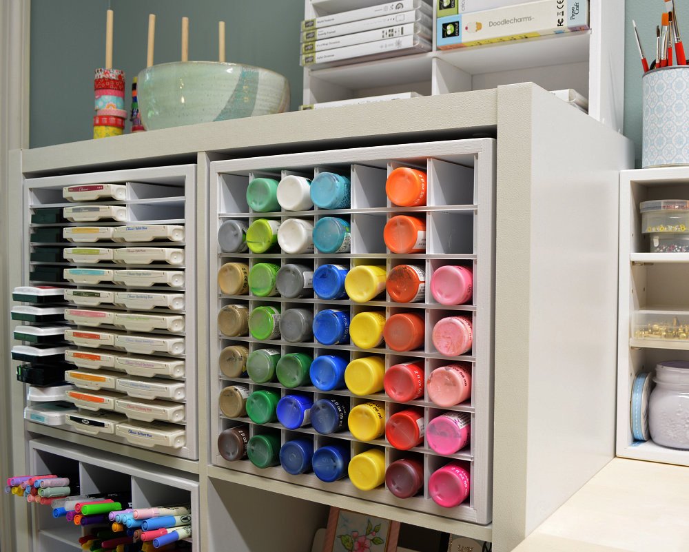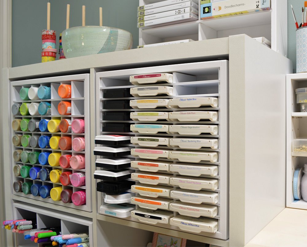 Next is the 36 Ink Pad Organizer, for all of the stampers out there. It is also designed to fit into the IKEA KALLAX line of shelves, and the unit has premium white corrugated plastic inserts that hold up to 36 ink pads that are 3 1/2 “ or less wide, and no more than 3 1/2” deep.