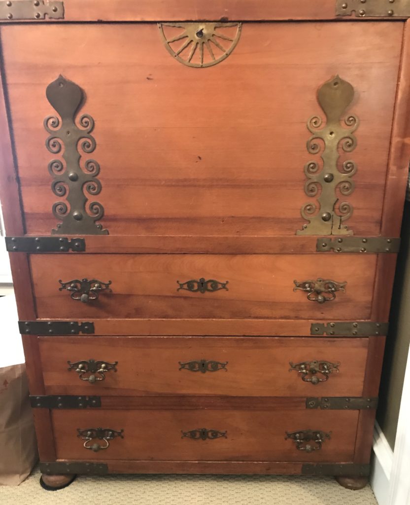 June 15, 2017As we helped our client organize her family’s craft supplies, we were met with a challenge (and we LOVE a challenge)! She needed an inconspicuous place to keep her craft supplies in the formal dining room, because for the time being it holds the biggest table in the house for working on projects. She needed the supplies close at hand, yet easily hidden during the holidays and when family or guests come over for dinner. Several storage options were discussed, but as soon as Leticia walked by the heirloom Military Campaign Chest (probably dating back to the 19th century) she had that lightbulb moment. It was already in the dining room (bonus!), and it had lots of drawers and cubbies that could potentially stash lots of craft supplies within arms reach of the table – a perfect solution! She explained her idea to the client, and we were given the green light to give it a try for storing all of her paper crafting goodies.